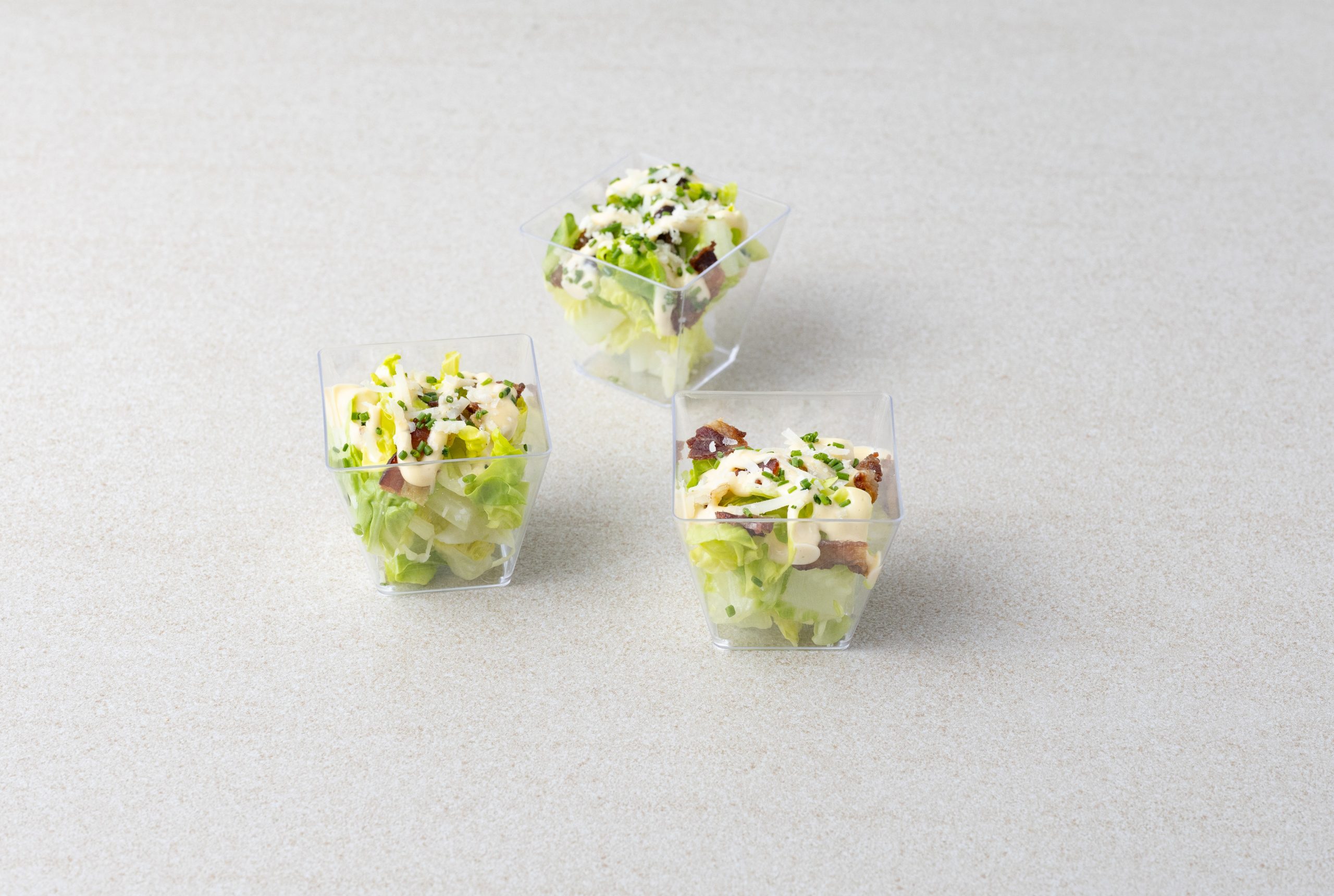 Baby gem, parmesan cheese, crispy bacon, caesar dressing, croissant, crostini, chives.